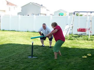 We went fishing for Fathers' Day this year. Well actually we went on Saturday, but it was for Fathers' day. We had a blast. Poor grandpa was very busy getting everyone's poles ready. He would finish one and the next person would want help. Once he finished that person the first person would be back for a new worm. It would of helped if we could have helped putting the worms on, but YUCK! Finally Grandpa actually got to fish. The boys ended up swimming in the lake more then they fished. At one point Austin was swimming, and all of our poles were sitting on the side of the lake and he looks at me and says " I Love fishing"! I guess they aren't true fishermen, but they had a blast. It is great that they have a grandpa and dad that will help them make such great memories. Finally Grandpa got to go on his own and fish. You can see him hiding in the reeds fishing. We Love you Grandpa!!! On Sunday we had a Father's Day dinner at my house. Emilee and her family came as well as Grandma and Grandpa. We ended up playing T-ball in the back yard. You can see were Eric and Scott got their love of Baseball. It was a great day. We love all of the Dads in our lives!!!!!